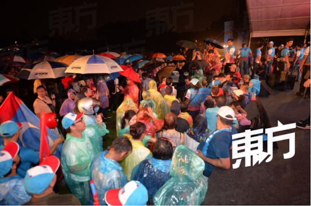惟,在约晚间8时许突然下起一场大雨,部分支持者急忙移到有棚的舞台旁躲雨,但更多人的人甘愿撑起雨伞或穿上雨衣在雨中等待。