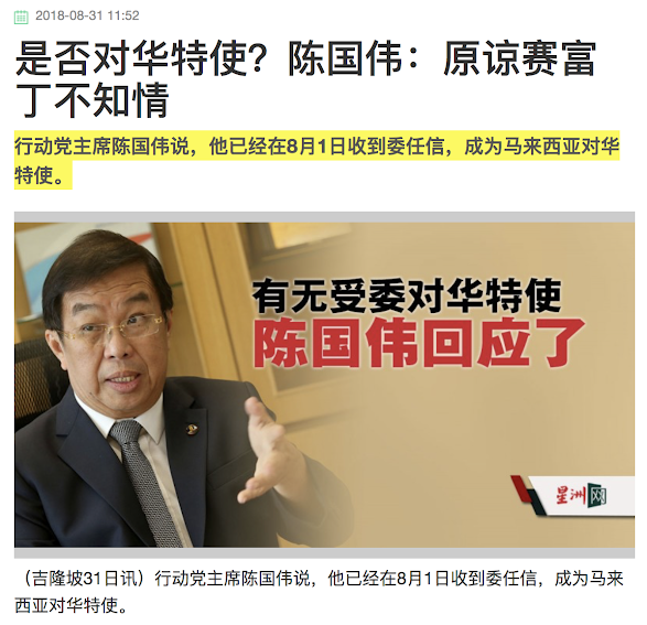 陈国伟今天在出席2018国际郑和大会新闻发布会上,证实本身已在8月1日,接到首相对华特使的委任状。